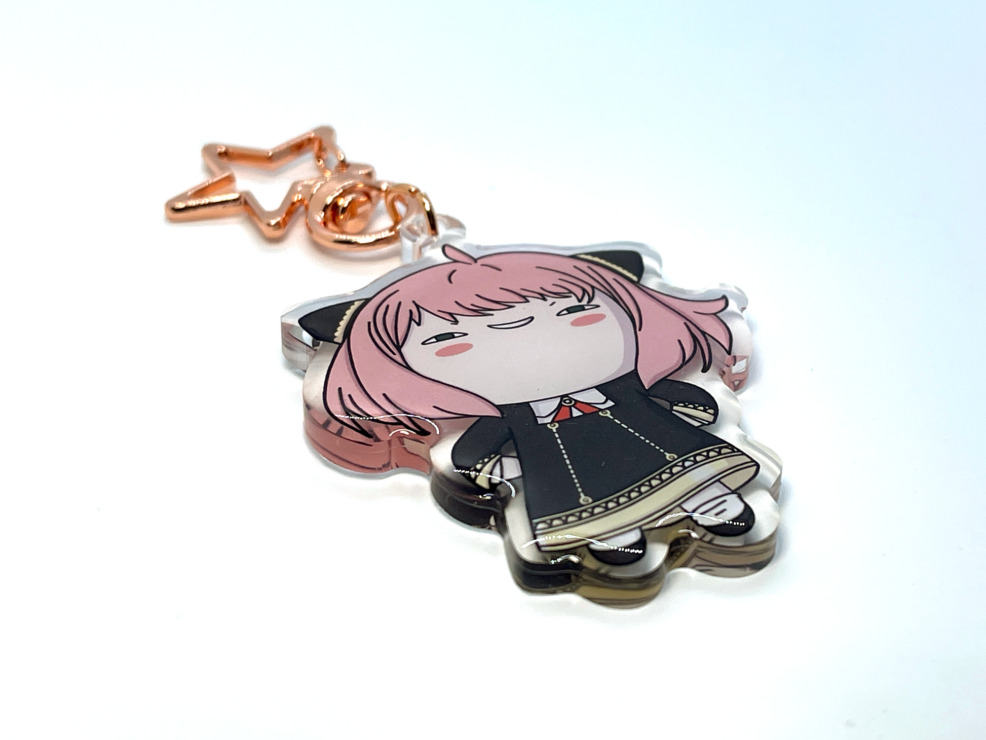 This charming clear acrylic keychain is the 'Anya' design and is durable, water resistant and light in weight. The acrylic charms are bright in colour and pattern and will not fall off, the edges are smooth and translucent. It is also top coated with a layer of epoxy to increase protection and longevity. The charm is pared with a pink U shaped clip to compliment the design.